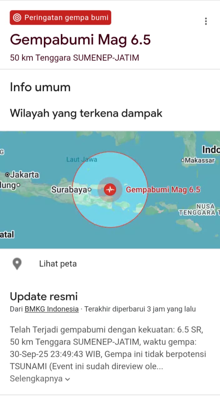 ๐ป๐ธ๐ฟ๐ ๐ ๐ฐ๐ฝ ๐ ๐ ๐ ๐ฐ๐ฑ๐ฐ๐ ๐ฐ Neอคwsอ – JATIM, Malam Selasa (30/9/2025) menjelang pergantian hari menjadi momen yang tak akan mudah dilupakan oleh warga Jawa Timur. Tepat pukul 23.49 WIB, bumi berguncang keras. Gempa berkekuatan 6,5 Skala Richter dengan pusat di laut, 50 kilometer tenggara Sumenep, Madura, meluluhlantakkan ketenangan malam.