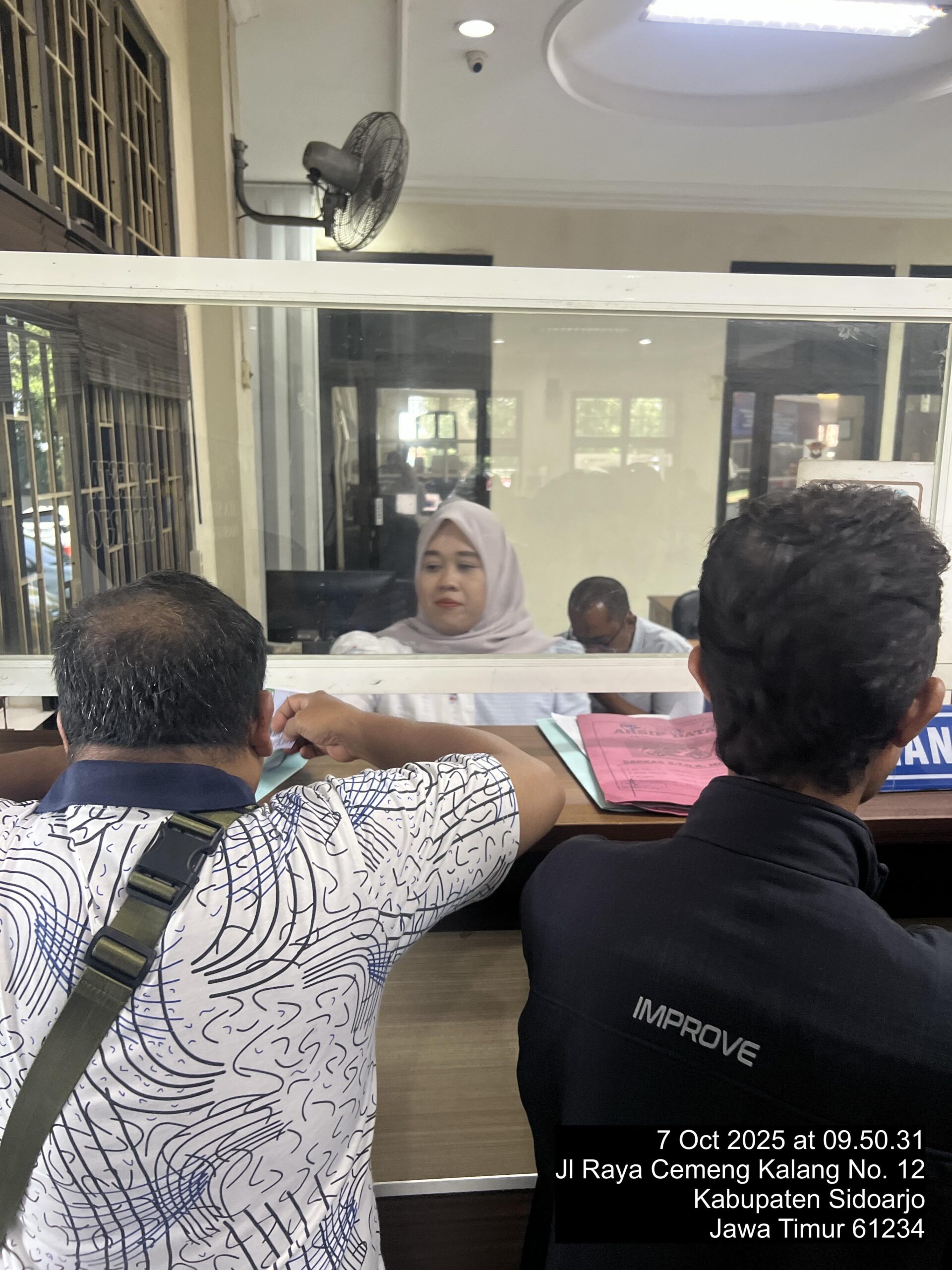 ๐ป๐ธ๐ฟ๐ ๐ ๐ฐ๐ฝ ๐ ๐ ๐ ๐ฐ๐ฑ๐ฐ๐ ๐ฐ Neอคwsอ – Sidoarjo, Pelayanan di Samsat Sidoarjo Kota kembali menuai apresiasi publik. Bukan hanya karena kecepatan dan ketepatan proses administrasi, tetapi juga karena sentuhan humanis dan kepedulian petugasnya terhadap masyarakat. Salah satu contohnya datang dari Aipda Chusairi, petugas yang sigap membantu seorang Wajib Pajak (WP) bernama Mas Ilur yang tampak kebingungan dalam proses pengurusan pajak lima tahunan kendaraan bermotor, Senin (7/10/2025) di kantor Samsat Sidoarjo Kota, Jl. Raya Cemeng Kalang No.12, Ngemplak, Sidoarjo, Jawa Timur.