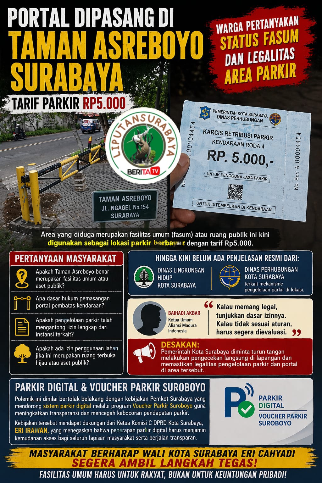 Liputan Surabaya – Surabaya, Polemik keberadaan portal dan pungutan parkir di kawasan Taman Asreboyo, Surabaya, turut menyoroti aspek hukum yang diatur dalam Undang-Undang Dasar Negara Republik Indonesia Tahun 1945.