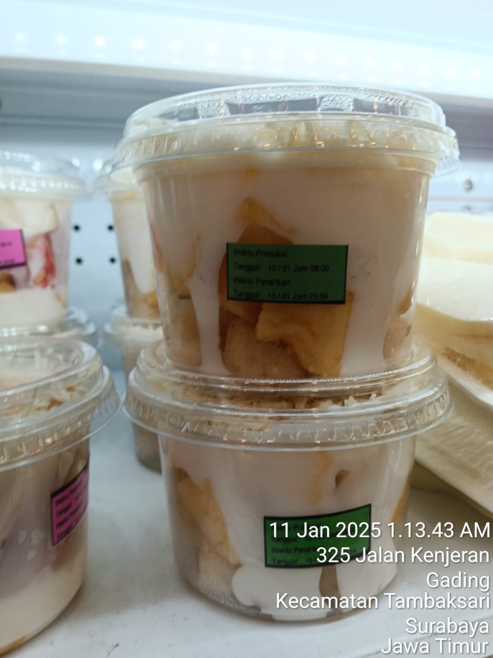 Pantauan awak media di lokasi menunjukkan beberapa salad buah di etalase memang tampak tidak segar, dengan tanda-tanda pembusukan seperti berjamur dan berlendir. Salah satu produk bahkan menunjukkan tanggal produksi 10 Januari 2025 pukul 08.00, padahal saat itu sudah masuk 11 Januari 2025 pukul 01.13 WIB. Produk tersebut masih tersedia di etalase.
