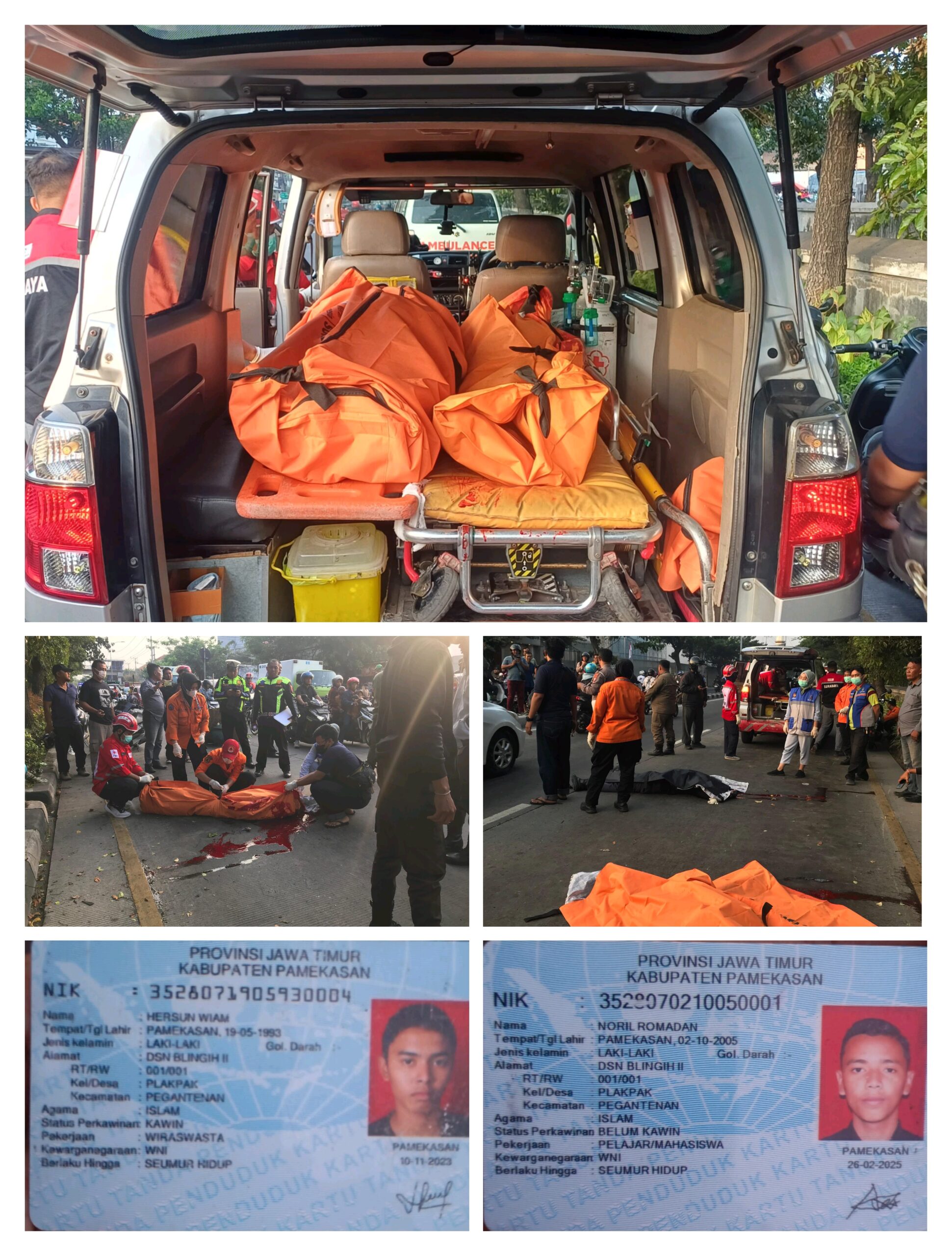 Petugas gabungan dari BPBD Kota Surabaya, Posko Terpadu Kedung Cowek, dan Tim Gerak Cepat (TGC) Kedung Cowek tiba di lokasi hanya empat menit kemudian. Setibanya di lokasi, dua korban sudah tergeletak di tengah jalan dalam kondisi meninggal dunia.