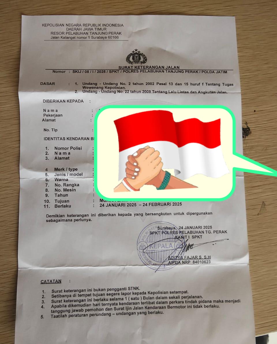 “Iya mas saya bayar Rp 100 ribu, untuk penerbitan Surat Keterangan Jalan. Namun saya tidak tahu nama petugas, posisinya duduk di Ruang SPKT sebelah pengurusan SKCK,” kata Rohim. Jumat (24/01/2025) sembari menunjukan SKIJ Nomer 08/I/2025/Polres Pelabuhan Tanjung Perak/Polda Jawa Timur, tertanggal 24 Januari 2025.