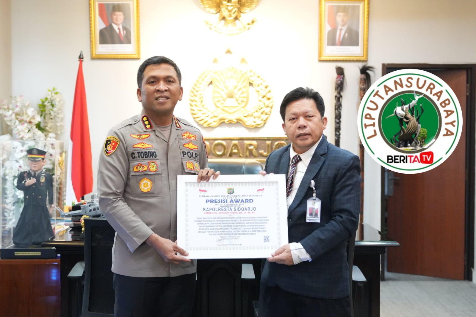 Penghargaan Presisi Award tersebut diberikan Direktur Eksekutif Lemkapi Dr. Edi Saputra Hasibuan kepada Kapolresta Sidoarjo Kombes. Pol. Dr. Christian Tobing di Mako Polresta Sidoarjo pada Rabu (18/2/26) yang lalu.