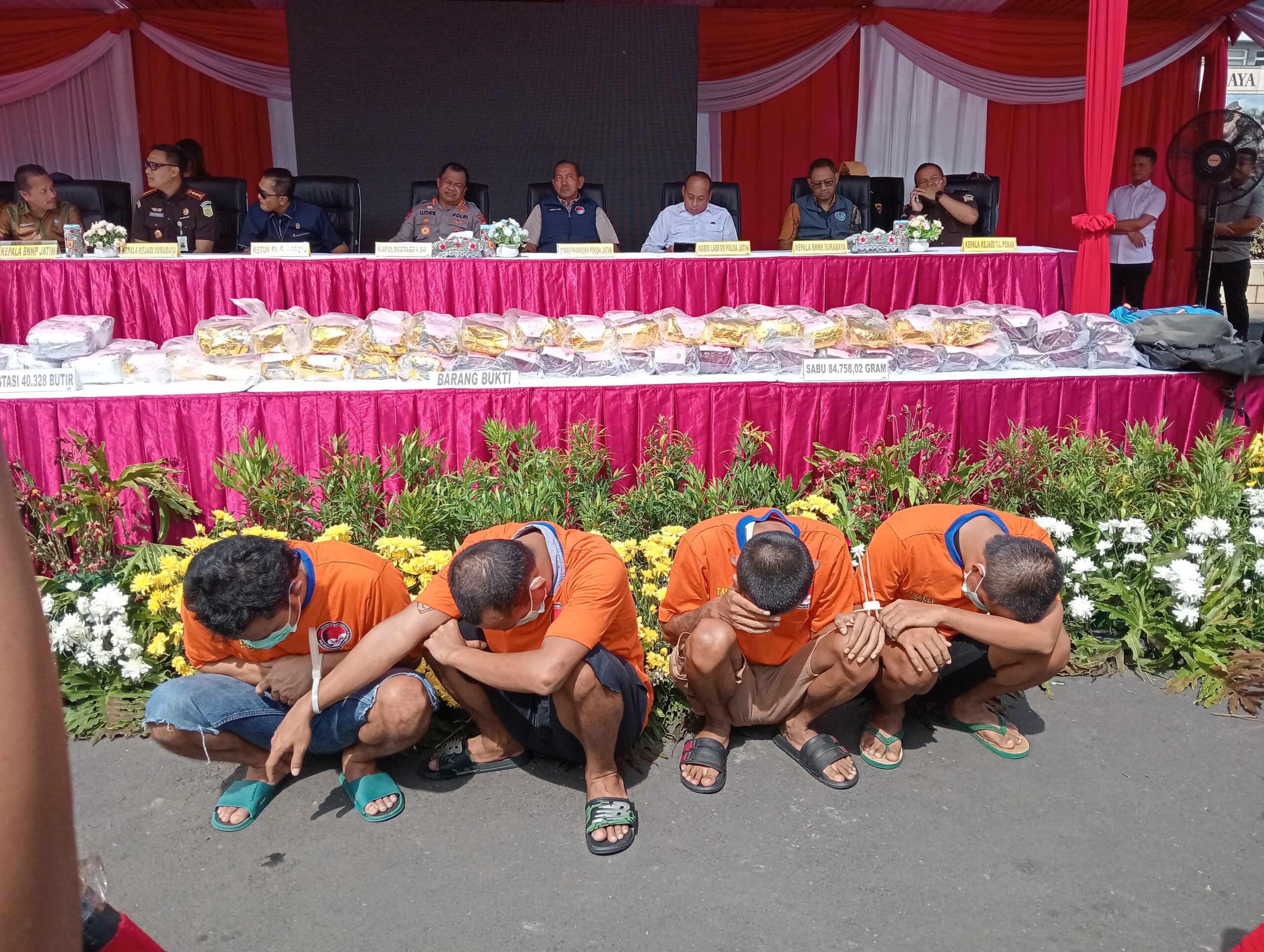 Dalam kesempatan itu, Polrestabes Surabaya juga melakukan pemusnahan barang bukti narkotika disaksikan jajaran pejabat terkait, mulai dari perwakilan Kapolda Jatim, Kepala BNN Surabaya, Ketua Pengadilan Negeri Surabaya, perwakilan Kejaksaan Negeri Surabaya dan Tanjung Perak, hingga organisasi masyarakat anti narkoba. Sebelum dimusnahkan, sebagian barang bukti diuji laboratorium untuk memastikan kandungan zat berbahaya.