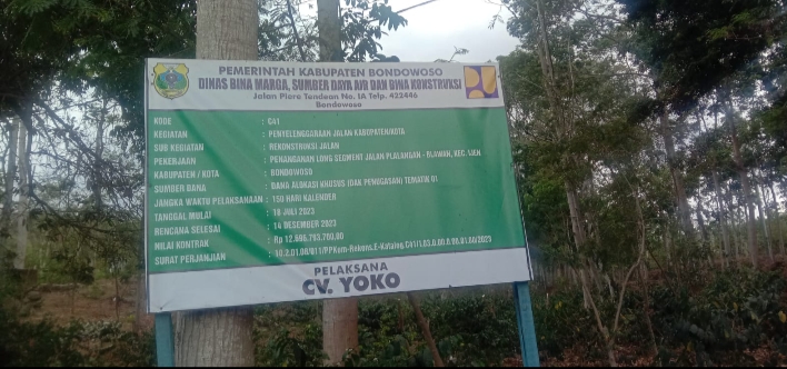 Liputan Surabaya- Bondowoso, Proyek Long Segment Jalan Plalangan – Blawan. Kecamatan Ijen, Kabupaten Bodowoso yang dikerjakan oleh CV. YOKO dengan nilia pekerjaan sebesar Rp.12.886.783.700 dilakukan pekerjaan mulai 18 Juli 2023- 14 Desember 2023 diduga tidak sesuai spek dan ada indikasi yang melakukan pekerjaan bukanlah dari CV YOKO.