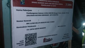 Liputan Surabaya – Surabaya, Proyek pembangunan saluran beton permanen di kawasan Gayung KebonsariโJetis Seraten, Surabaya, bernilai Rp9,6 miliar dari APBD 2025, menuai sorotan. Pekerjaan yang digarap CV Cipta Karya Mandiri di bawah naungan Dinas Sumber Daya Air dan Bina Marga (DSDABM) Pemkot Surabaya itu diduga mengabaikan sejumlah tahapan teknis penting.