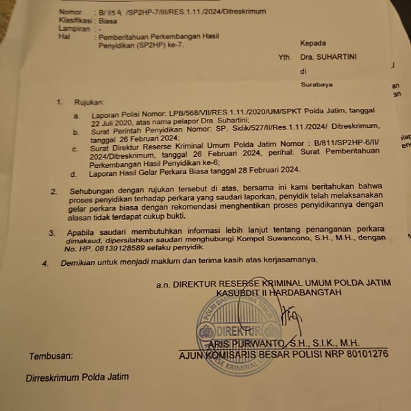 “Atas Kejadian tersebut, kemudian saya laporan ke Polda Jatim, pada 22 Juli 2020, namun tiba-tiba saya mendapatkan surat dari Polda Jatim yang menyatakan kalau laporan tersebut dihentikan dengan alasan kurang cukup bukti. Padahal saya sudah serahkan bukti tranferan,” keluh Suhartni kepada awak media.