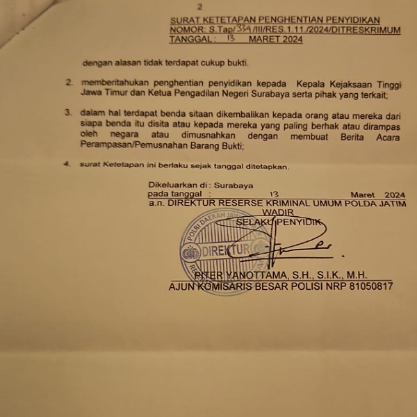 Terpisah Kab Humas Polda Jatim, Kombes Pol Dirmanto, terkait adanya Surat Penghentian Penyidikam (SP3) yang dikeluhkan pelapor, belum memberikan pernyataan resmi.