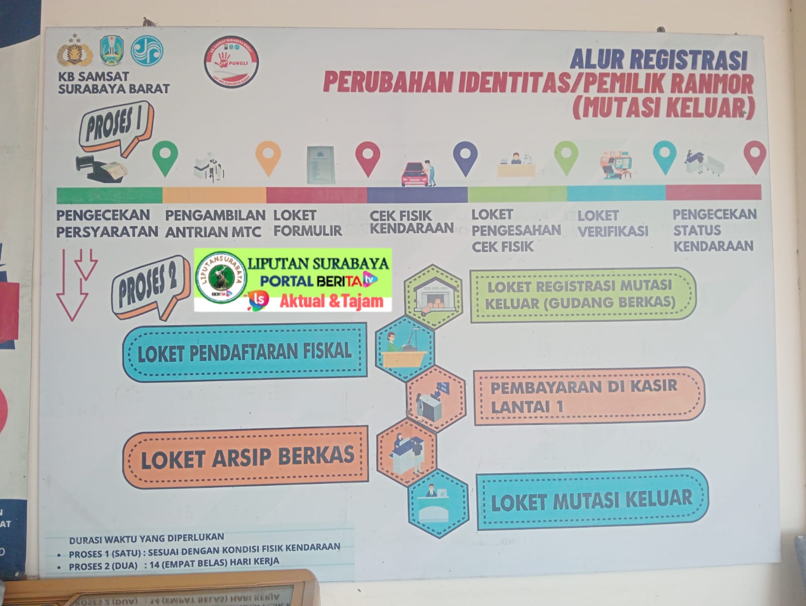 “Di Gedung Samsat Surabaya Barat, inovasi berupa penyediaan papan informasi alur mutasi kendaraan menjadi salah satu langkah nyata dalam mempermudah wajib pajak memahami prosedur pelayanan. Dengan adanya informasi yang jelas dan terstruktur, masyarakat dapat mengikuti setiap tahapan tanpa kebingungan maupun ketergantungan pada pihak lain.