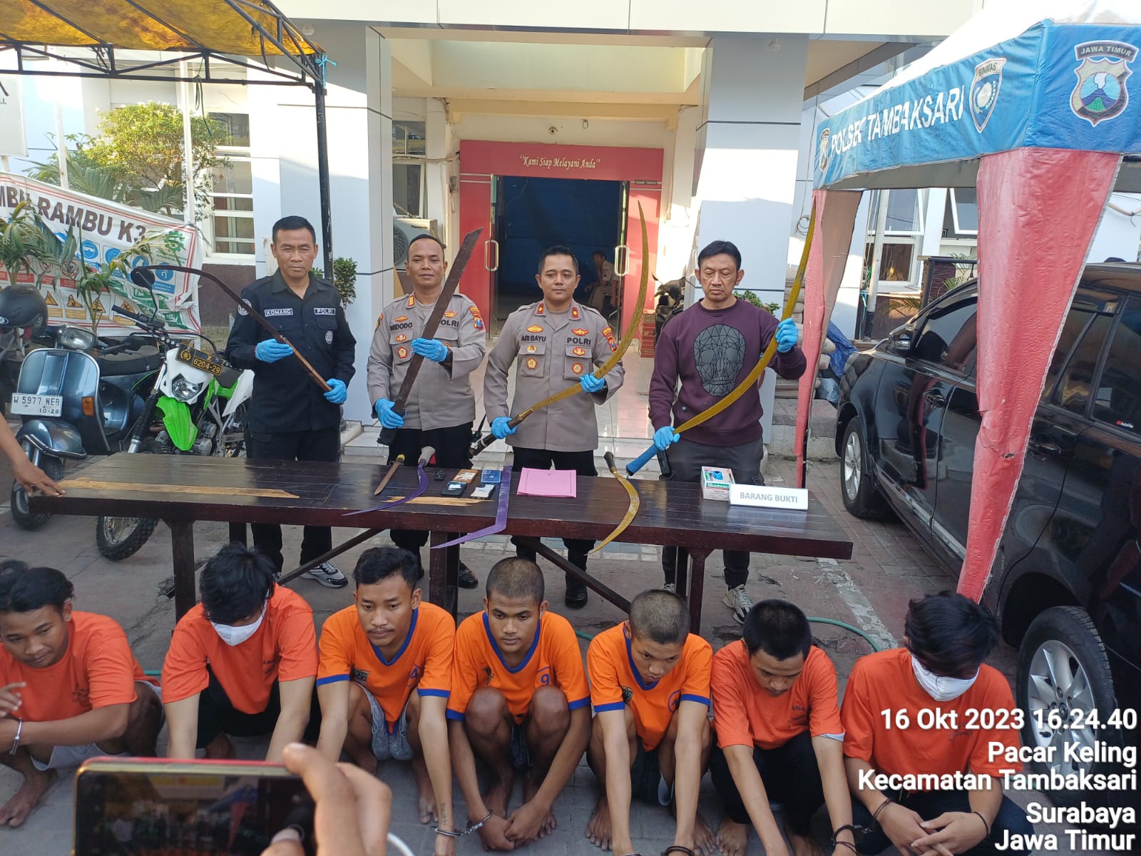 Kapolsek Tambaksari Kompol Ari Bayuaji.,S.E.,S.I.K.,M.Si menambahkan, ” 7 (tujuh) Remaja beserta barang bukti 9 (sembilan) buah senjata tajam kita amankan di Polsek Tambaksari untuk dilakukan Penindakan. Dan kita masih memburu 1 (remaja) DPO atas nama Yori, alamat : Jl. Kalijudan Sby yang merupakan Ketua Gangster Gukguk.