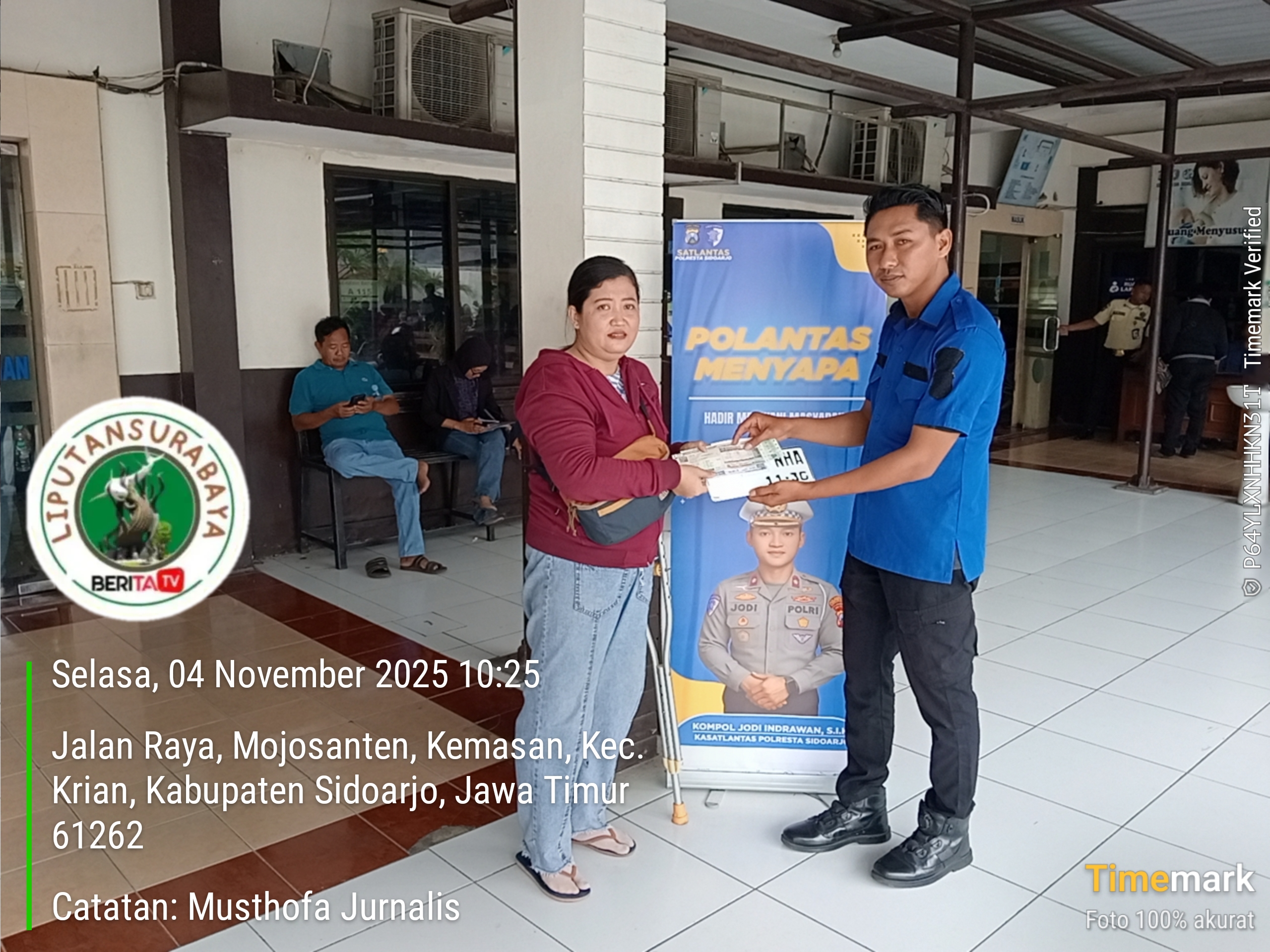 Liputan Surabaya – Sidoarjo, 4 November 2025 – Program “Polantas Menyapa” yang digelar oleh Ditlantas Polda Jatim melalui KB Samsat Krian kembali menjadi sorotan publik. Kali ini, aksi humanis datang dari Briptu Yudi, petugas polisi lalu lintas yang sigap membantu seorang wajib pajak difabel bernama Ibu Okta saat mengurus proses BBN 1 (Bea Balik Nama Kendaraan Bermotor Pertama).