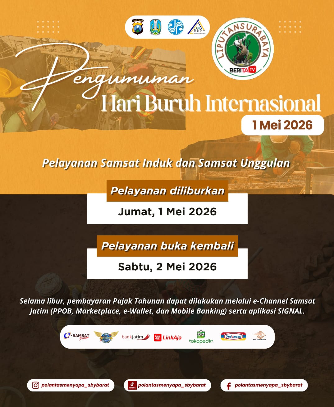 ๐ป๐ธ๐ฟ๐ ๐ ๐ฐ๐ฝ ๐ ๐ ๐ ๐ฐ๐ฑ๐ฐ๐ ๐ฐ Neอคwsอ – Surabaya, Kantor Bersama (KB) Samsat Surabaya Barat menegaskan komitmennya dalam memberikan pelayanan yang sopan, santun, dan humanis kepada masyarakat wajib pajak, meski terdapat penyesuaian jadwal operasional dalam rangka peringatan Hari Buruh Internasional, Jumat, 1 Mei 2026.