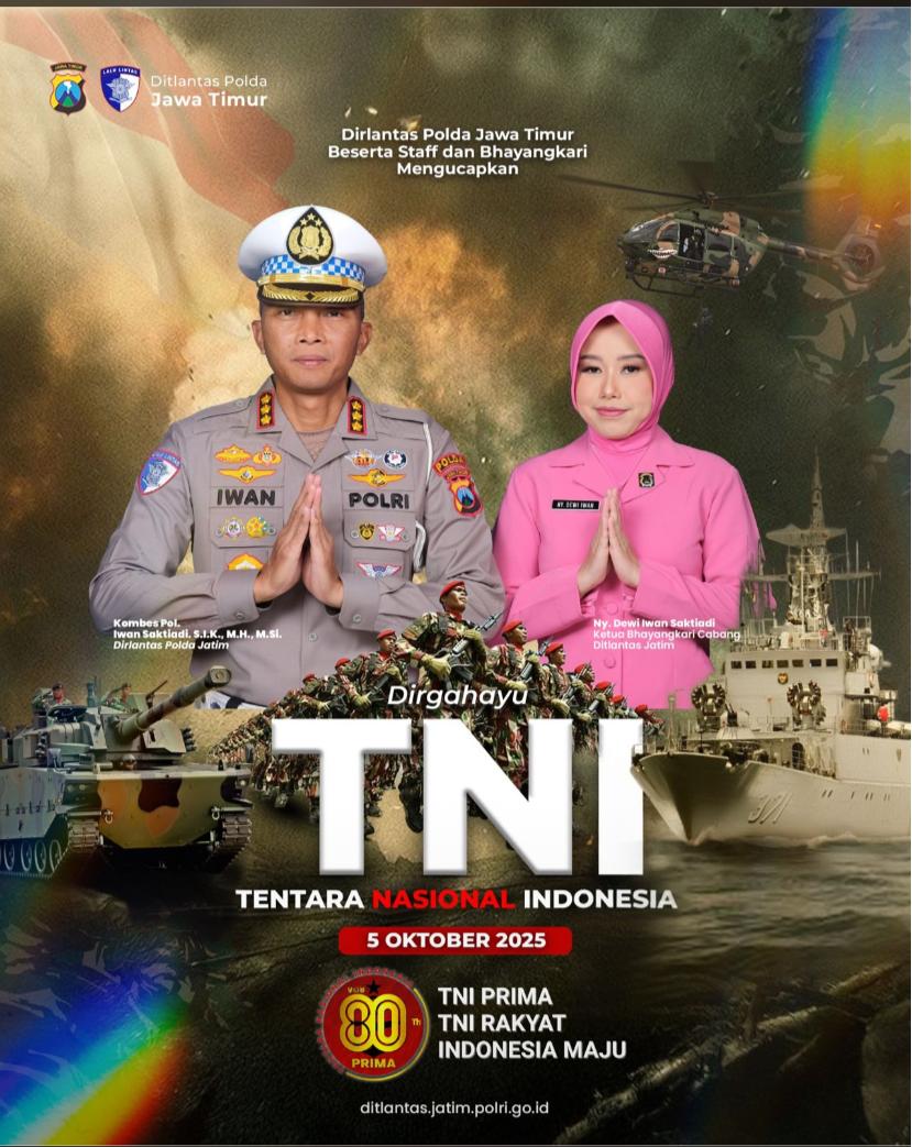 🄻🄸🄿🅄🅃🄰🄽 🅂🅄🅁🄰🄱🄰🅈🄰 Neͤws͛ Surabaya, 5 Oktober 2025 – Dalam rangka memperingati Hari Ulang Tahun Tentara Nasional Indonesia (TNI) ke-80, Direktur Lalu Lintas Polda Jawa Timur Kombes Pol Iwan Saktiadi, S.I.K., M.H., M.Si., bersama Ny. Dewi Iwan Saktiadi selaku Ketua Bhayangkari Cabang Dirlantas Polda Jatim, menyampaikan ucapan selamat dan apresiasi kepada seluruh prajurit TNI di tanah air.