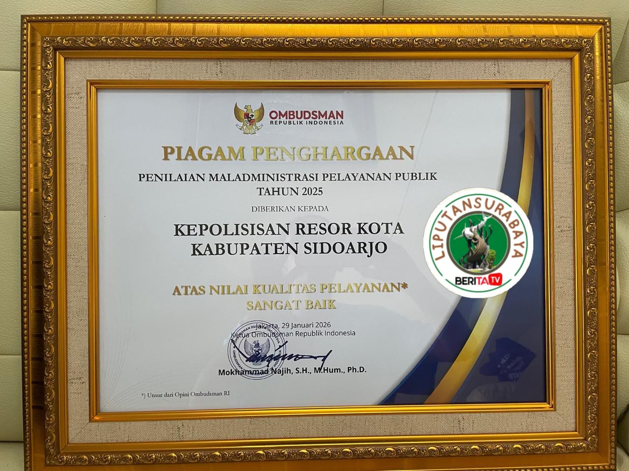Liputan Surabaya – Sidoarjo, Komitmen Kepolisian Negara Republik Indonesia dalam meningkatkan kualitas pelayanan publik kembali membuahkan hasil. Kali ini, Kepolisian Resor Kota (Polresta) Sidoarjo berhasil meraih Piagam Penghargaan dari Ombudsman Republik Indonesia atas Penilaian Maladministrasi Pelayanan Publik Tahun 2025 dengan predikat โSangat Baikโ.