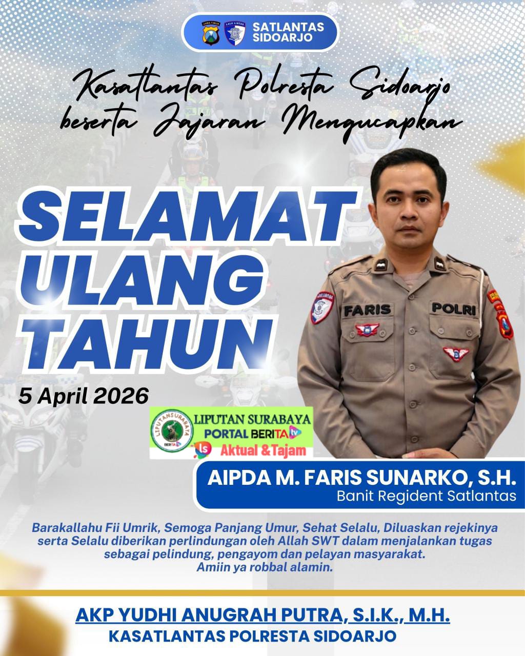 Liputan Surabaya – Sidoarjo, Jajaran Satuan Lalu Lintas (Satlantas) Polresta Sidoarjo menyampaikan ucapan selamat ulang tahun kepada Aipda M. Faris Sunarko, S.H., yang genap berusia satu tahun lebih matang pada 5 April 2026.